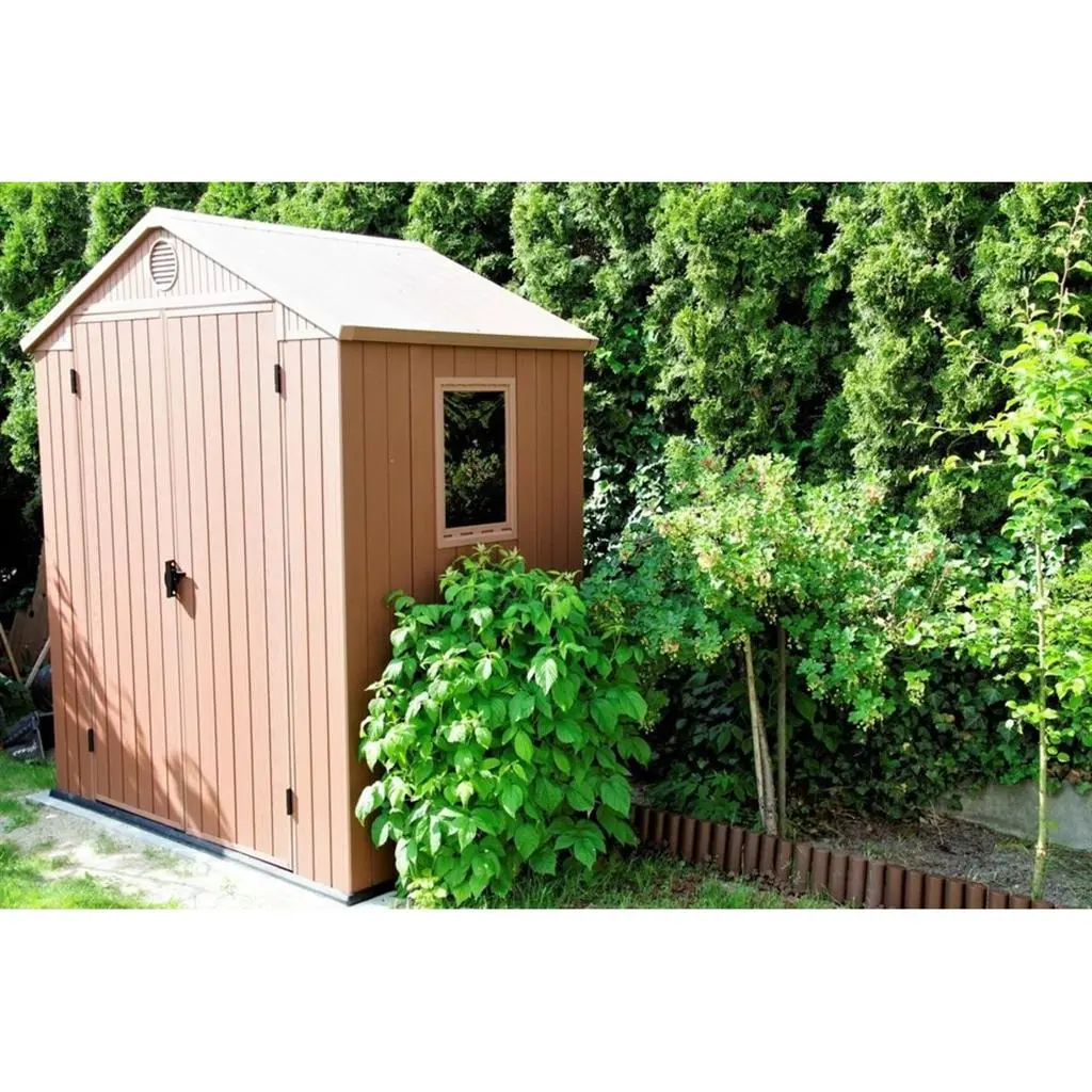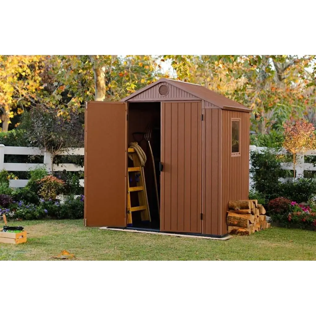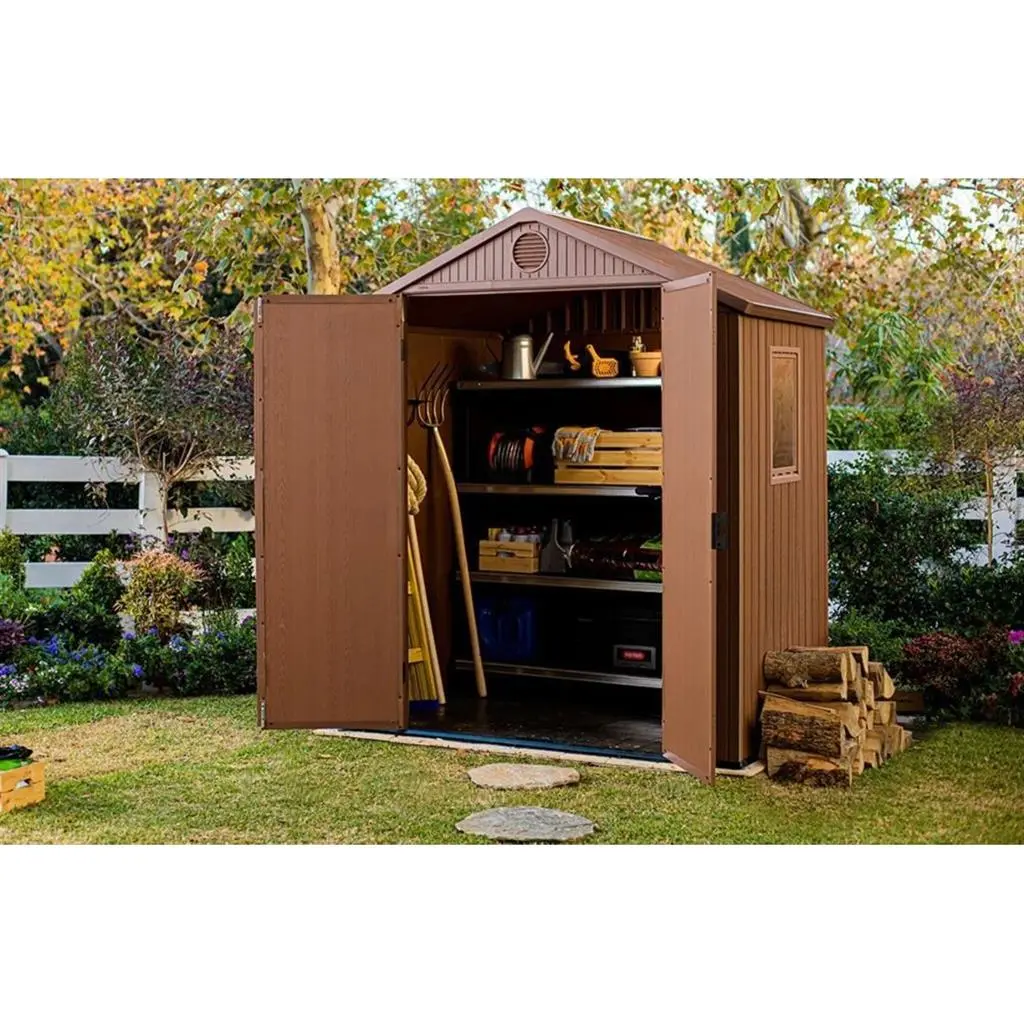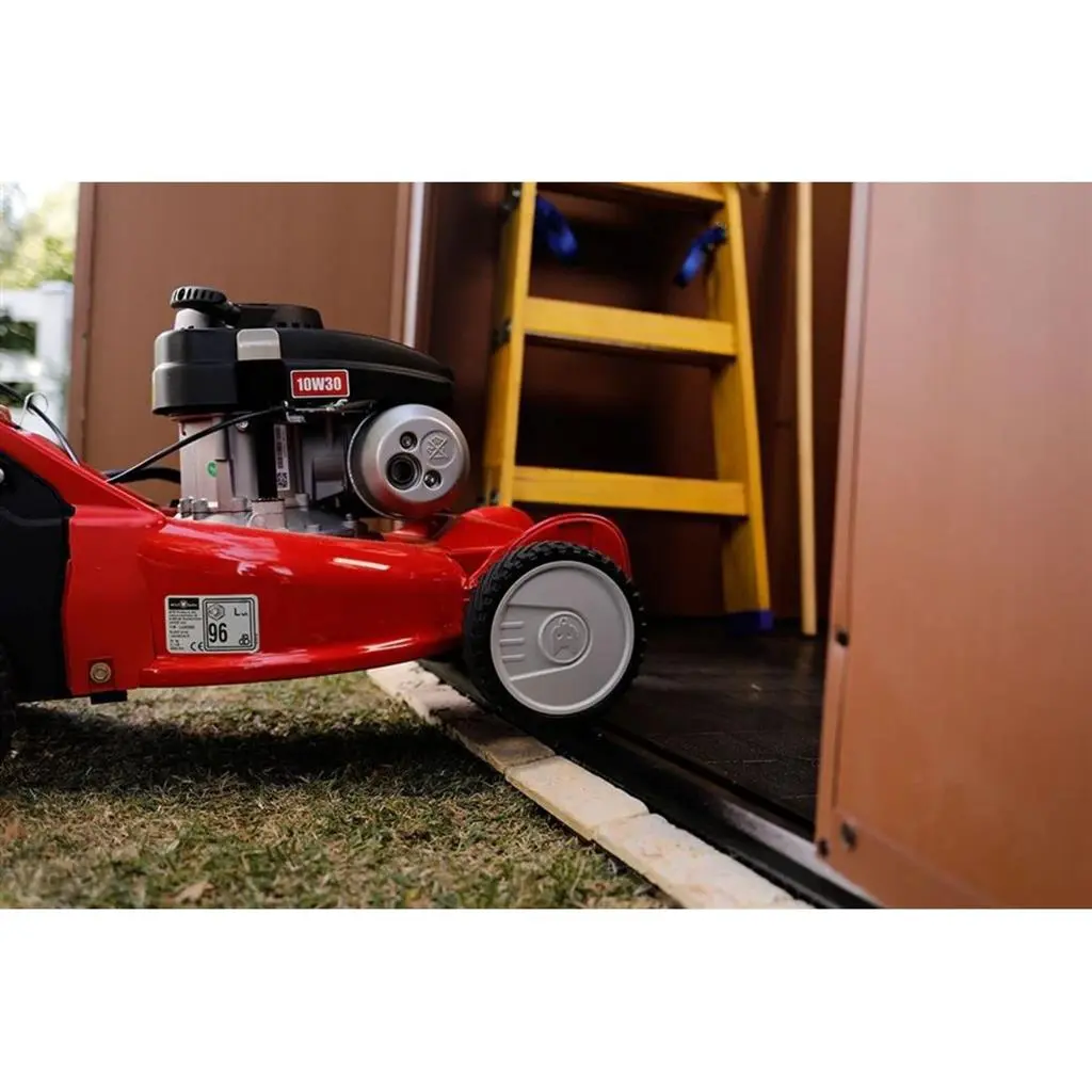 Къщата разполага с двойни врати, които се отварят широко и улесняват поставянето и изваждането на градински инструменти, косачки, велосипеди, BBQ оборудване, мебели или други обемни вещи, като вътрешното пространство остава лесно достъпно.
