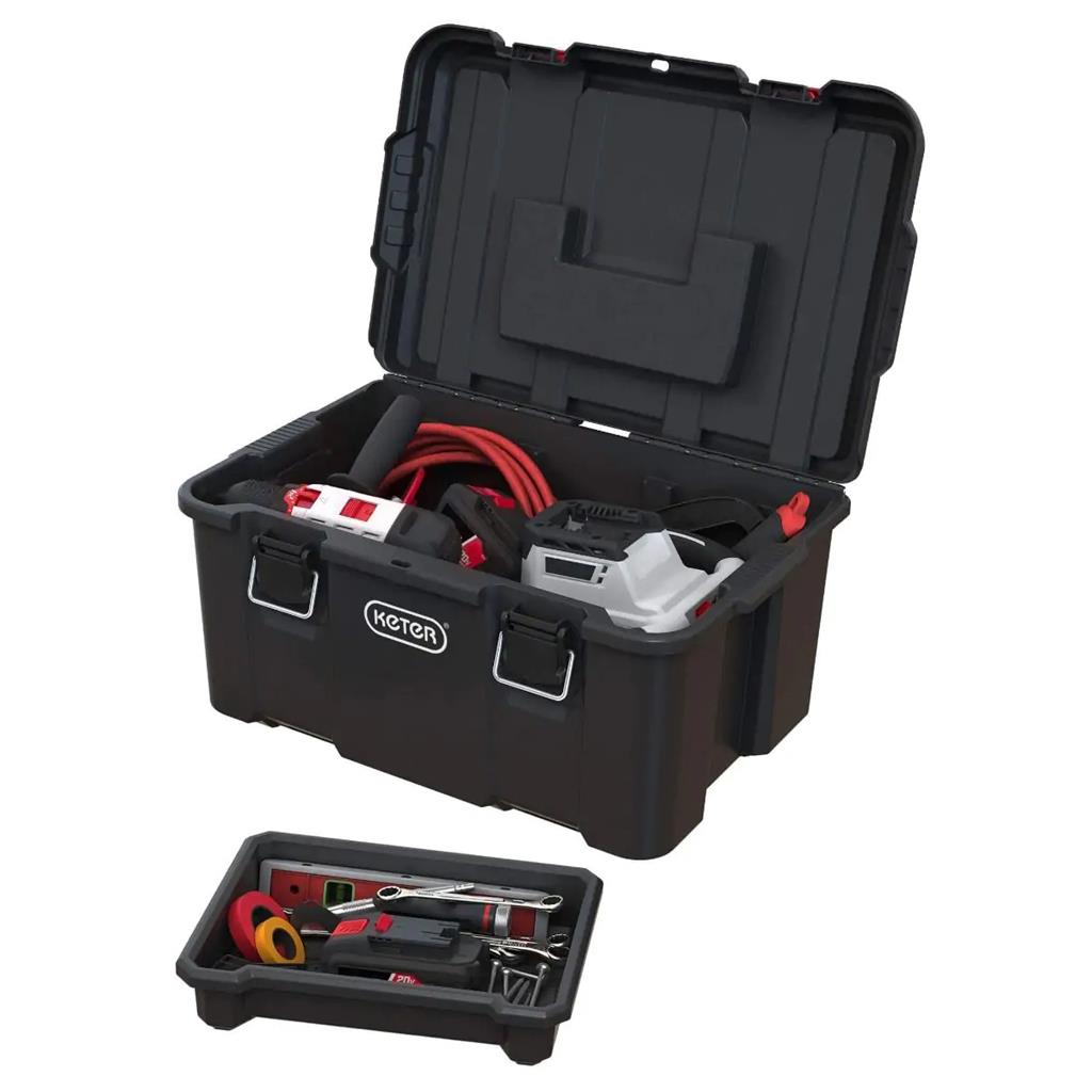 Кутията за инструменти е изработена от висококачествена, издръжлива пластмаса. Материалът е високо устойчив на механични повреди, което гарантира дълготрайна издръжливост на продукта. Вътре има два практични органайзера за дребни аксесоари и поставка за по-големи инструменти, като например винтоверти, ключове, тестери.