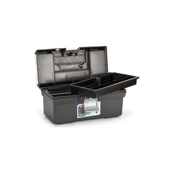 Перфектното решение за хора, които искат да организират своята работа с голям куфар за инструменти. Изработен е от здрава и издръжлива пластмаса. Разполага с удобна дръжка, която улеснява пренасянето, функционални прегради и здрави панти, които предотвратяват случайното отваряне на куфара. Също така има две кутии в капак на куфара за малки крепежни елементи и аксесоари, които се свалят.