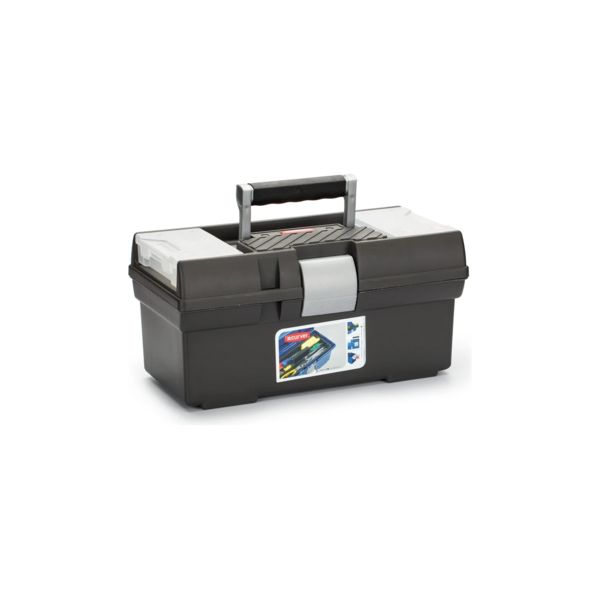Перфектното решение за хора, които искат да организират своята работа с голям куфар за инструменти. Изработен е от здрава и издръжлива пластмаса. Разполага с удобна дръжка, която улеснява пренасянето, функционални прегради и здрави панти, които предотвратяват случайното отваряне на куфара. Също така има две кутии в капак на куфара за малки крепежни елементи и аксесоари, които се свалят.