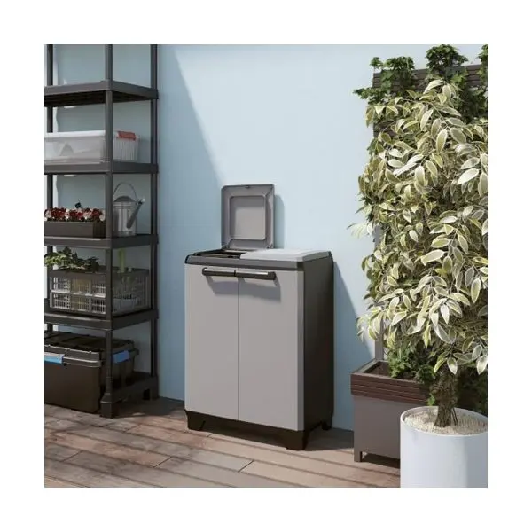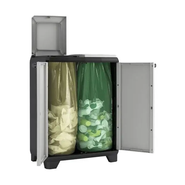 Шкафът за сортиране на отпадъци Split Premium ще улесни сегрегацията на отпадъците у дома – без бъркотия и неприятни миризми. Този модел е идеален за външна употреба – пред дома. Шкафът Split Premium е изработен от пластмаса с високо качество, което гарантира дълготрайна издръжливост и надеждност. В просторната конструкция могат да се поберат два чувала с максимален капацитет от 110 литра всеки. Важно е, че те са поддържани от специални рамки, които предотвратяват самостоятелното им изплъзване. Този модел е оборудван със система PUSH, която осигурява лесно и бързо отваряне на контейнера. Здравата конструкция е монтирана на четири масивни и повдигнати крака, което значително улеснява почистването и поддържането на чистота под мебелите. Минималистичната и проста форма, както и приглушените цветове, правят шкафа за сортиране на отпадъци Split Premium да се вписва перфектно във всяко домашно оформление. Шкафът е предназначен за самостоятелно сглобяване и е лесен за монтаж.