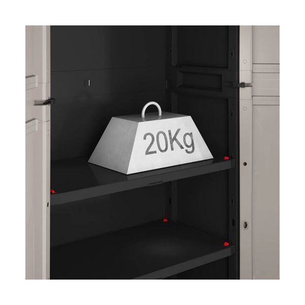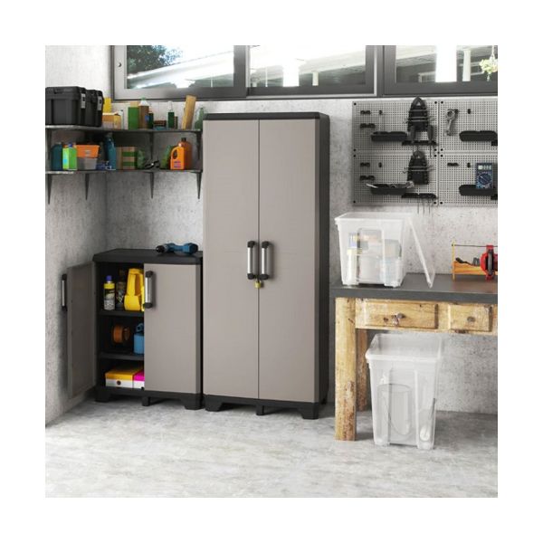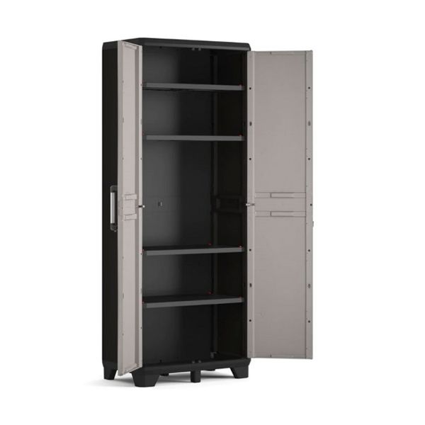 Шкафът KETER Linear Tall Cabinet е изработен в модерен стил и се отличава с елегантен черен цвят. Корпусът и вратите са направени от здрава пластмаса, която гарантира дълготрайност и лесна поддръжка.